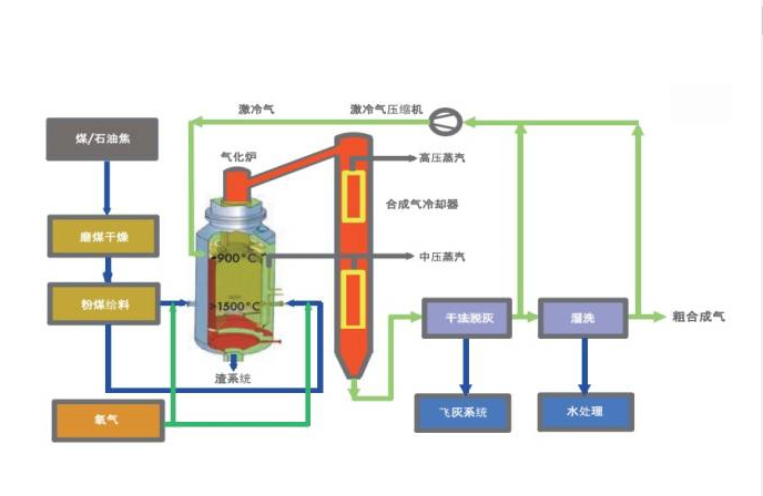 干粉氣化工藝的基本過程:原煤加助燃劑,破碎磨成煤粉,由高壓氮氣流輸送進氣化爐,在壓力4.1 MPa、溫度1500—1600℃的條件下,與配加的氧氣和水蒸汽瞬時完成揮發(fā)分脫除、裂解、燃燒及轉(zhuǎn)化的一系列物理化學過程,氣化產(chǎn)物為粗合成氣,煤灰熔化以液態(tài)流出。
