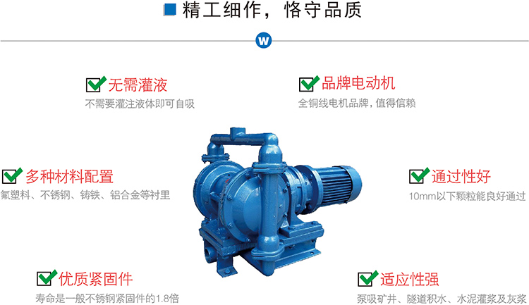 DBY 型電動隔膜泵是 一種新型的泵類。本泵應(yīng)用于石化、陶瓷、冶金等行業(yè),這種泵的主要特點(diǎn)是不需灌引水。直徑 在10毫米以下的顆粒、泥漿等均可以毫不費(fèi)力地通過。由于隔膜將被輸送介質(zhì)和傳動機(jī)械件分開,所以介質(zhì)不會向外泄漏,且泵本身無軸封,使用壽命大大延 長。根據(jù)不同介質(zhì),隔膜分為氯醇橡膠、氟橡膠、丁晴橡膠等,可以滿足不同用戶的要求。