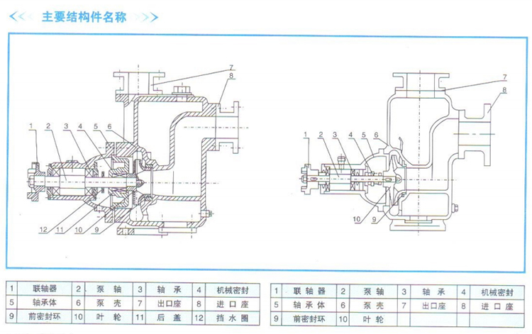 在一些泵的軸承體底部還設(shè)有冷卻室。當軸承發(fā)熱引起軸承體溫升超過70度時,可在冷卻室處通過任意一只冷卻液管接頭,注人冷卻液循環(huán)冷卻。泵內(nèi)部防止液體 由高壓區(qū)向低壓區(qū)泄漏的密封機構(gòu)是前后密封環(huán),前密封環(huán)裝在泵體上,后密封環(huán)裝在軸承體上,當泵經(jīng)長期運轉(zhuǎn)密封環(huán)磨損到一定程度,并影響到水泵的效率及自 吸性能,應給予更換.
