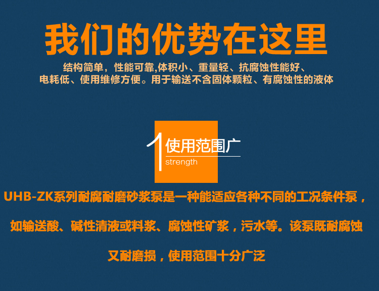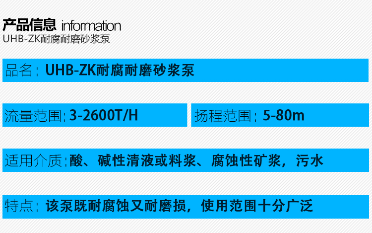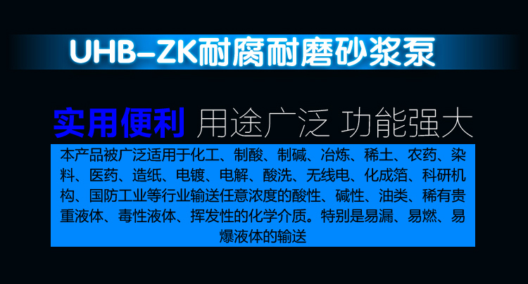 UHB-ZK耐腐耐磨砂漿泵能適應(yīng)各種不同的工況。如:既可以傳送酸、堿類清液或料漿,也可以輸送冶煉行業(yè)各種腐蝕性礦漿,還可以輸送硫酸行業(yè)各類稀酸、環(huán)保行業(yè)的各類污水等。可輸送濃度80%以下的硫酸、50%以下的硝酸、鹽酸等積各類酸、堿、鹽的料漿,稀有金屬冶煉行業(yè)的各種腐蝕性砂漿及食品,酒類行業(yè)中的各類混合型介質(zhì)。該泵既耐腐蝕又耐磨損,使用范圍十分廣泛。