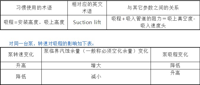 工業泵用戶一般要求泵的吸程(從吸入液面到泵吸入口的中心的垂直高差)高, 但國內的泵標準及規范里,似乎沒有吸程這一術語。與它相關的術語是必須空化余量,約等于10-吸程(m, 沒有考慮吸入阻力)。我們認為可以將吸程與國內外的相關術語及相互之間的關系作如下對照: